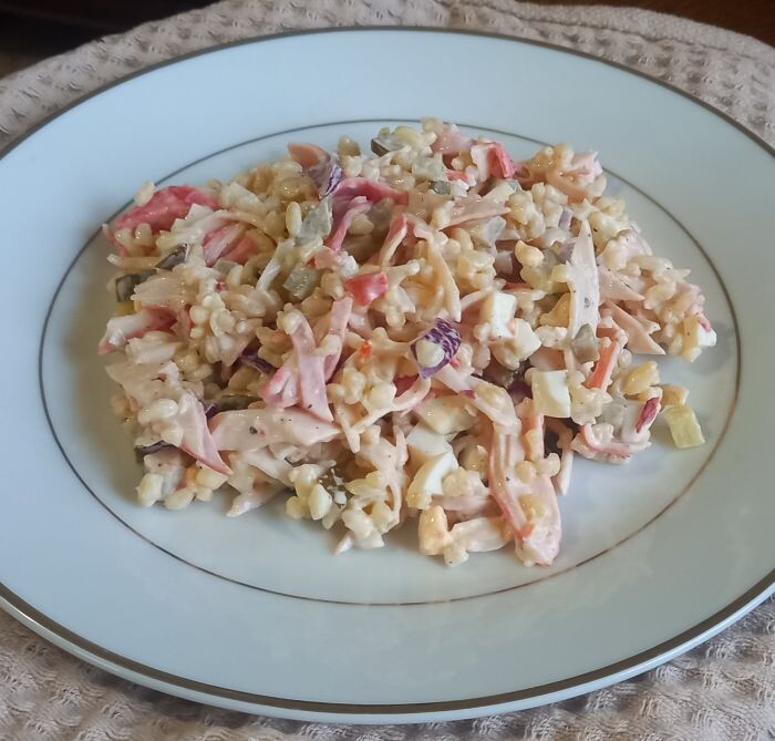 1) Нарезать или нарвать крабовые палочки 2) Добавить вареное яйцо 3) Добавить репчатый лук, лучше салатный 4) Добавить булгур 5) Добавить соленый огурец 6) Заправить майонезом и ложечкой аджики, если есть свежая. Соль не добавляю дополнительно. Могу черный перчик молотый, ароматный Отлично получается