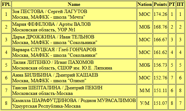 Привычно представленная тремя парами группа "Тим Тутберидзе" снова выступила на высоком уровне и при этом сообразно тому статус-кво, который сложился между парами в процессе сезона. Ольга Сабада/Павел Астахов (170.85 - 7 место) с одной грубой ошибкой выступили в произвольной программе, а перед этим многовато нагрязнили в короткой. Есть у этой пары перспективы, но нужно продолжать работать буквально над всеми элементами и результаты обязательно пойдут вверх, а пока Ольга с Павлом оказались седьмыми.