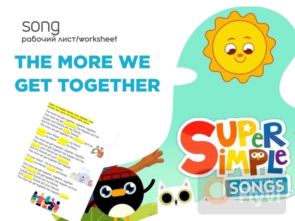 Worksheet for "The more we get together" song by Super Simple Songs Рабочий лист к песне The more we get together song by Super Simple Song. Fill in the missing words. Вставить пропущенные слова. (сложные слова как friend and together, cause) Как мы работаем с ней 1. Смотрим и слушаем по ссылке https://rutube.ru/video/5e7ed1baefc337f4b9485178bc32bd4f/ 2. Пробуем вставить пропущенные слова без повторного включения, так как песенка "прилипчивая". И потом включаем песенку без просмотра, для работы с текстом. Download worksheet. Скачать рабочий лист тут группа ВКонтакте с другими моими разработками: