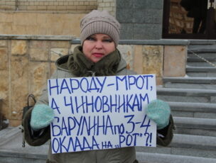 В Балаково сегодня утром пройдет заседание депутатов Собрания Балаковского района. Один из вопросов на повестке о протесте прокуратуры по поводу декабрьского решения о повышении зарплат сотрудникам балаковской администрации, о доплатах им до 400% к окладу, о повышении оклада главе района Сергею Барулину на 127 тысяч. Перед началом заседания активистка Надежда Познякова вышла к мэрии на одиночный пикет. Она стояла с плакатом «Народу – МРОТ, а чиновникам Барулина по 3-4 оклада на «РОТ»?!». Сказала, что хочет посмотреть в глаза депутатам и напомнила, что есть кому повысить зарплату – учителям, врачам.