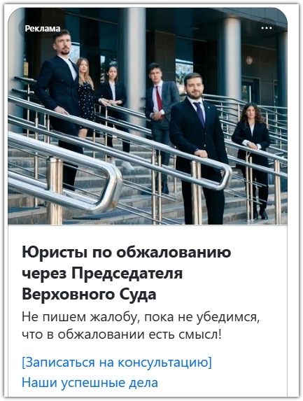 Попытки завлечь клиента и показать свои теневые возможности выглядят иногда так, что можно брать этих юристов за ушко и допрашивать на предмет того - а как они это возможности заполучили? Такие "решалы" обычно не вникают в тонкости рекламных ограничений, и стремятся показать связи, не особо и скрываясь. Пример - рекламный баннер, который яндекс мне заботливо подсунул прямо на канале. Насладитесь мастерством маркетолога и хитростью копирайтера: Интересно, что значит "Через председателя Верховного Суда"? У меня как у обывателя сложилось мнение, что товарищ юрист в деловом костюме с дипломатом, в котором лежит проект моей касатки, заходит в кабинет Председателя ВС, минуя секретаршу, достаёт жалобу и пальчиком пододвигает к председателю с просьбой: "Ознакомьтесь, пожалуйста, и скажите - есть ли в обжаловании смысл?" И получает ответ: "Да, тут хорошие шансы на победу" или "Не стоит и пытаться". Или картинка ещё лучше: вечером после рабочего дня в неофициальной обстановке без галстуков,