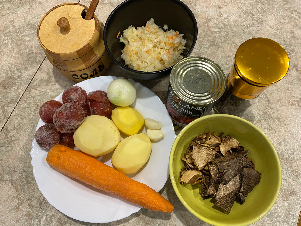 Уже в понедельник начинается пост) и я хочу вам предложить рецепт вкуснейших щей с квашеной капустой с фасолью🔥 Для приготовления нам понадобится: 3 шт. среднего размера картофеля; 1 большая морковь; 1 средняя луковица; 2-3 зубчика чеснока; помидоры (у меня из заморозки) 1 банка фасоли в собственном соку (можно заменить отварной); 30 гр сушеных грибов (у меня ассорти из белых и красноголовиков); 150 гр квашеной капусты; соль, черный перец, растительное масло для обжаривания овощей. Подготавливаем продукты: В кастрюлю (у меня объем 3,5 л) выкладываю картошку, капусту, грибы. Водичку, в которой замачивали грибы, аккуратно процеживаем через марлю и добавляем в кастрюлю, но можно этого и не делать) Заливаем все водой и ставим на огонь. Доводим до кипения, снимаем образовавшуюся пену, подсаливаем по вкусу и кипятим 20 минут. В это время на сковороде с раскаленным растительным маслом обжариваем лук, морковь. В самом конце добавляем в пережарку помидоры и чеснок. Обжариваем еще пару минут,