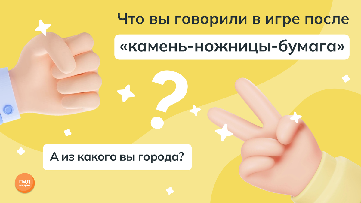 На прошлой неделе мы с вами обсуждали известное всем пирожное и его название, получили много клёвых ответов: лидирует, конечно, полоска (но и она была и песочной, и александровской, и школьной), но были и такие варианты — сандвич, помадка, берёзка, мраморное, домино, летнее! Вы в шоке? Мы да! Но подождите, у нас для вас есть ещё кое-что интересное. Все мы играли в детстве в «камень-ножницы-бумага» (хотя будем честны — когда на кону мытьё посуды, можно и сейчас зарубиться с собственным ребёнком). И, как вы знаете, в этой игре после слов «камень-ножницы-бумага» и перед тем, как показать фигуры, произносится присказка, которая может звучать по-разному. В редакции ГМД-медиа, например, встретился вариант «бу цэ фа». БУ ЦЭ ФА, ДРУЗЬЯ!!! Нам кажется, что это переплюнуть сложно, но давайте попробуем: