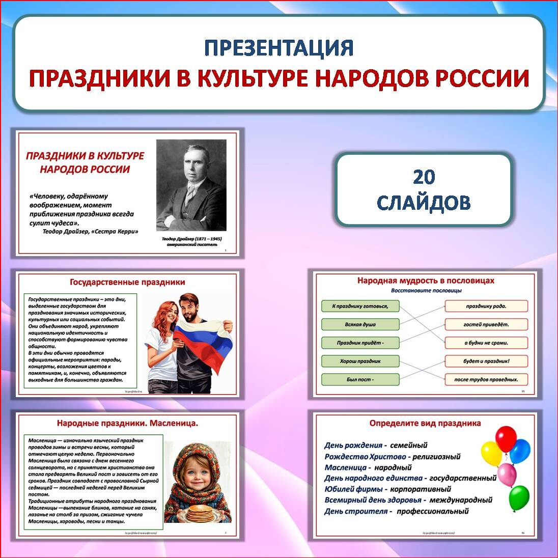 Презентация «Праздники в культуре народов России» разработана к уроку ОДНКНР в 5 классе в соответствии с ФОП. Презентацию можно использовать как отдельно, так и в комплекте с рабочим листом (ссылка дана ниже) Презентация состоит из 20 слайдов. Слайды № 3, 16,17,18,19 анимированы. По щелчку появляются ответы. Слайд № 1. Титульный слайд. Высказывание Теодора Драйзера «Человеку, одарённому воображением, момент приближения праздника всегда сулит чудеса». Слайд № 2. Какие бывают праздники. Слайд № 3. Подумаем вместе. Почему праздники важны? Слайд № 4. Государственные праздники. Слайд № 5. Семейные праздники. Слайд № 6. Религиозные праздники. Слайды № 7-15. Народные праздники (Масленица, Сабантуй, Навруз, Вардавар, Ысыах, Праздник оленеводов, Сурхури, Яран Сувар, Сагаалган). Слайд № 16. Определите вид праздника. Слайд № 17. Традиции праздников. Слайд № 18. Какие праздники отмечают в следующие даты? Слайд № 19. Восстановите пословицы о праздниках. Слайд № 20. Высказывание Демокрита «Жизнь без