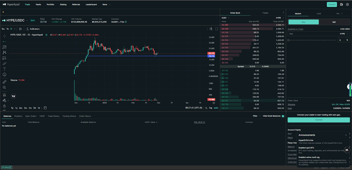 Основной продукт Hyperliquid — это его бессрочный контракт DEX, который позволяет трейдерам получать до 50-кратного плеча по BTC, ETH, SOL и другим активам. У него полностью on-chain книга заказов и нулевая комиссия за газ. В отличие от Solana, которая поддерживает широкий спектр децентрализованных приложений (DApp), Layer-1 Hyperliquid создан специально для оптимизации эффективности DeFi-трейдинга.