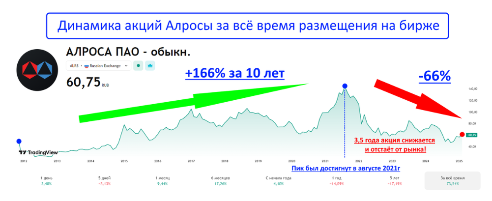 До середины 2021г акции Алросы имели восходящий долгосрочный тренд, выросли за 10 лет на 166%, но затем ситуация поменялась и сейчас акции находятся в просадке уже больше 4х лет, подешевев за это время почти в 3 раза (со 145р на максимуме до 48р).