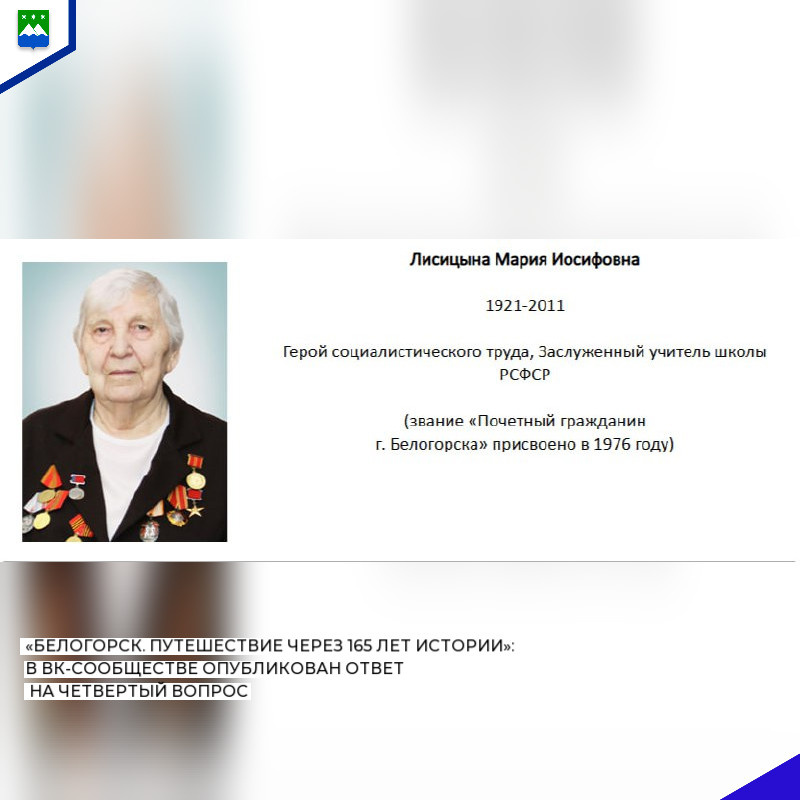 В официальном ВК сообществе (https://vk.com/bel_adm) администрации Белогорска продолжается историческая рубрика «Белогорск. Путешествие через 165 лет истории». Цикл тематических публикаций организован совместно с Централизованной библиотечной системой, подготовившей исторические материалы. — Ответы на вопрос оставили 7 подписчиков, — рассказала специалист пресс-службы Евгения Осауленко. — Сегодня ВК-сообщество «Администрация г. Белогорск» (https://vk.com/bel_adm) опубликовало правильный ответ на четвертый вопрос по истории Белогорска: ежегодно в Амурской области около 20 ребят получают стипендию им. Героя Социалистического труда, заслуженного учителя РСФСР Марии Иосифовны Лисицыной. Следующий вопрос будет опубликован в официальном сообществе администрации Белогорска во ВКонтакте 3 марта. Принять участие в интерактиве к юбилейному Дню города может любой желающий, подписавшись и поставив лайк на публикации с вопросом. Также, нужно написать ответ в комментариях. По итогам всех ступеней и