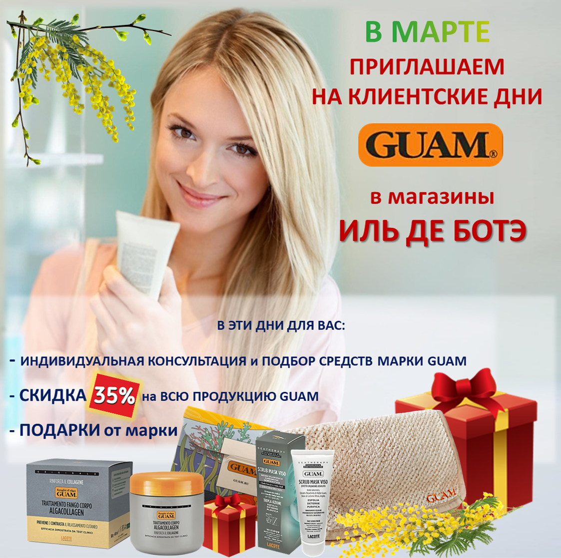 Дорогие друзья! 🌺 Приглашаем вас в марте на клиентские дни в парфюмерно-косметические магазины Иль Де Ботэ! Специалисты марки GUAM помогут подобрать вам индивидуальный уход за телом, лицом и волосами! Будут подарки 🎁 и приятные скидки!👍🏻 Приходите! Мы вас ждём! ❤️☺️