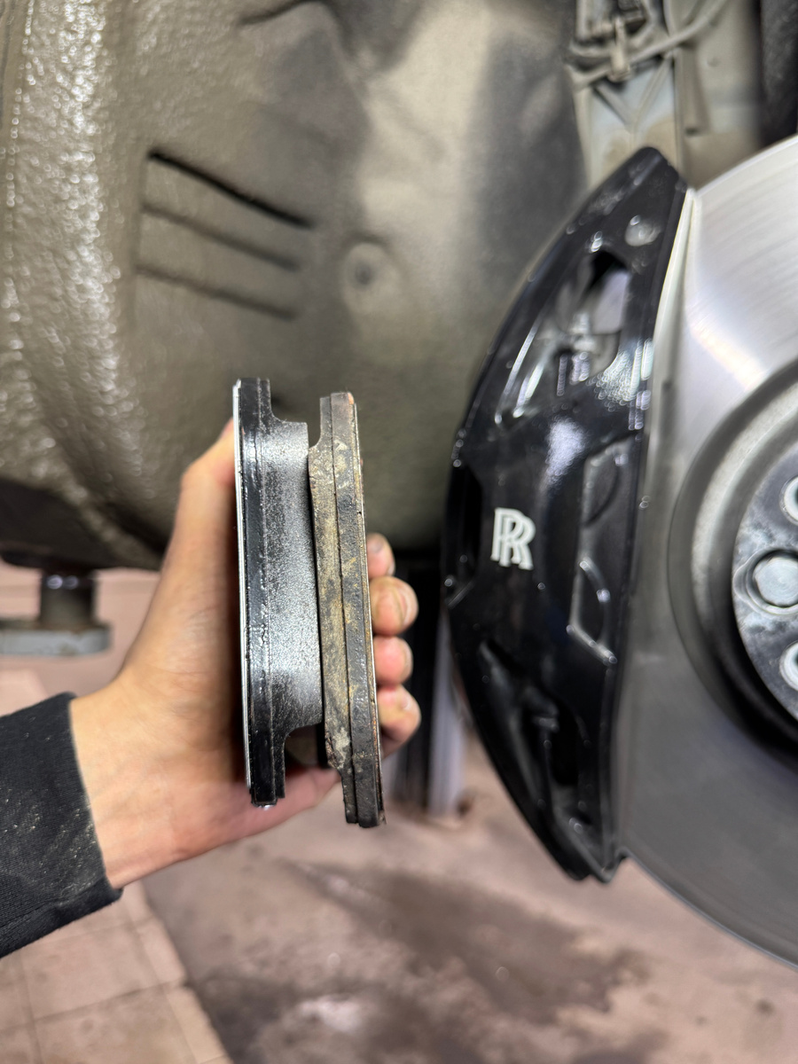 Rolls-Royce Cullinan на замене передних тормозных колодок. Расходный материал, зап.части Вы можете заказать и сразу заменить у нас.