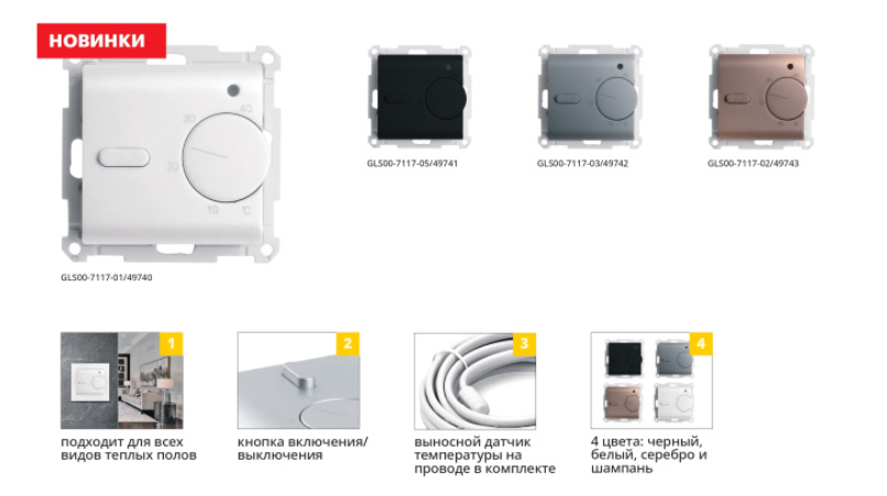 Компания Feron представляет новую серию механических терморегуляторов GLS00-7117 серии Катрин STEKKER, предназначенных для управления системами теплого пола. Эти устройства обеспечивают надежное поддержание комфортной температуры в помещении благодаря простоте использования и точности регулировки. Терморегуляторы GLS00-7117 имеют номинальное напряжение 250 В и номинальный ток 16 А, что позволяет им эффективно управлять нагрузкой до 3500 Вт. Устройства оснащены подсветкой с красным и синим цветами, что облегчает их использование в условиях недостаточного освещения. Тип установки — скрытый, а размеры изделия составляют 73×73×50 мм, что обеспечивает их компактность и удобство монтажа. Материал корпуса выполнен из поликарбоната и латуни, обеспечивая долговечность и надежность конструкции. Степень защиты IP20 гарантирует безопасность эксплуатации в жилых помещениях. Серия Катрин предлагает несколько цветовых решений терморегуляторов GLS00-7117: Это позволяет подобрать устройство, гармонирую