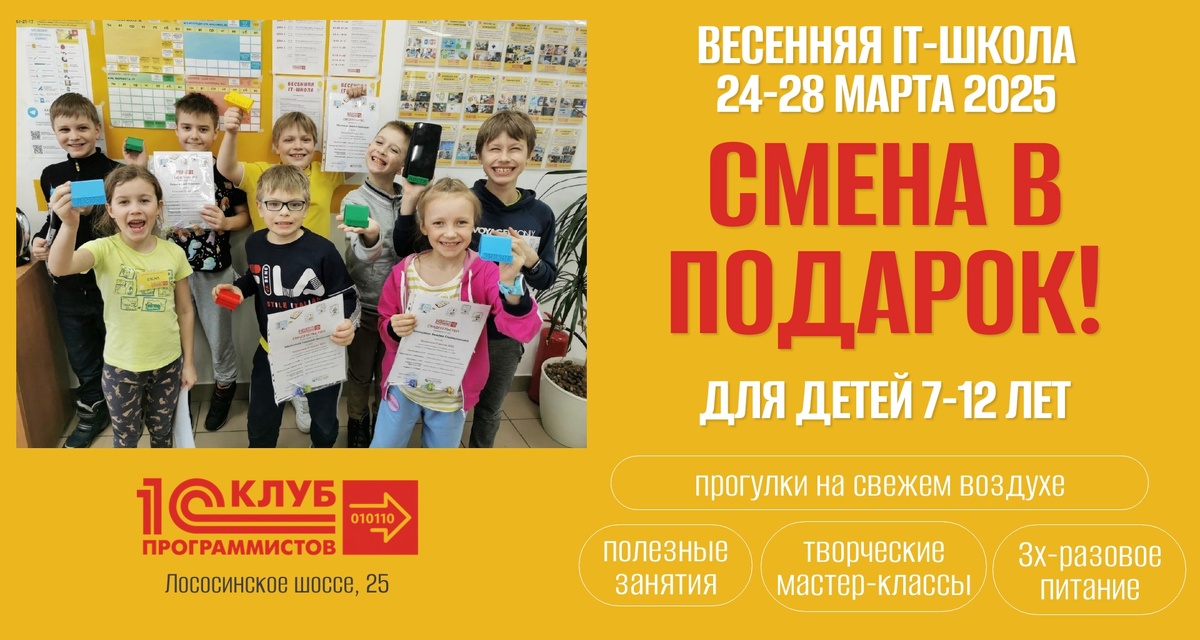 Присоединяйтесь к весенней IT-школе 2025 и откройте мир технологий для вашего ребенка! Сроки: 24-28 марта 2025 Место: Лососинское шоссе, 25 Две возрастные группы: 7-9 лет и 10-12 лет Подробности и запись Спешите! Для новичков при записи до 5 марта действует специальная цена!