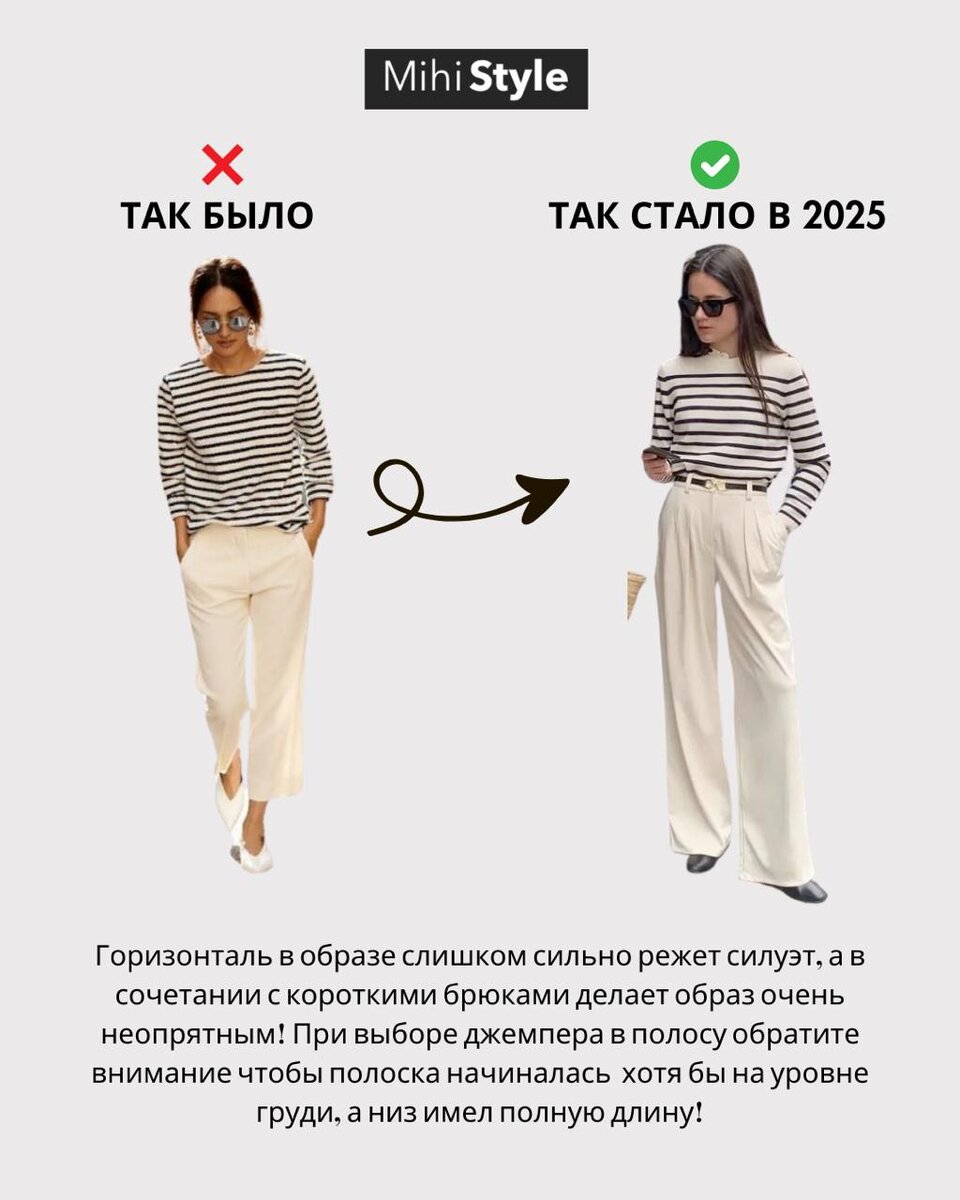 Привет, мои дорогие подписчики! Сегодня я хочу поговорить о том, как изменилась мода за последние годы. Мы разберем несколько образов, которые раньше считались актуальными, и сравним их с тем, как мы носим похожие вещи сейчас. Разница порой кроется в деталях, но именно они делают образ современным и стильным. Давайте начнем! Раньше джемперы в полосу часто носили с короткими брюками, что создавало эффект "обрезанного" силуэта. Это могло выглядеть неопрятно, особенно если горизонтальная полоса начиналась слишком высоко. Сейчас мы обращаем внимание на то, чтобы полоска начиналась на уровне груди, а низ джемпера был полной длины. Это создает более гармоничный силуэт. Брюки также выбираем полноразмерные, чтобы избежать эффекта "короткости". Кардиганы раньше носили длинными, часто не заправляя их, что могло скрывать фигуру. Современный образ предполагает укороченные кардиганы, которые можно заправлять или носить как самостоятельный верх. В сочетании с широкими брюками это создает контра