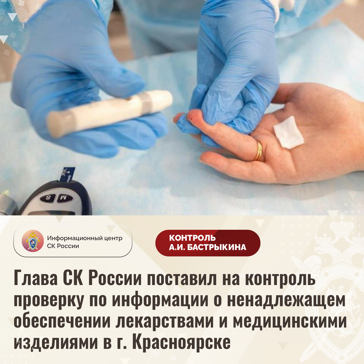 Глава СК России поставил на контроль проверку по информации о ненадлежащем обеспечении лекарствами и медицинскими изделиями в г. Красноярске В СМИ сообщается о нарушении прав инвалидов, в том числе детей, из города Красноярска, страдающих сахарным диабетом. С начала текущего года профильные структуры систематически отказывают гражданам в выдаче льготных жизненно необходимых лекарственных препаратов и медицинских изделий. Обращения граждан результатов не принесли. В ГСУ СК России по Красноярскому краю и Республике Хакасия по данному факту организована процессуальная проверка. Председатель Следственного комитета Российской Федерации Александр Иванович Бастрыкин поставил ход процессуальной проверки на контроль в центральном аппарате ведомства и поручил и.о. руководителя ГСУ СК России по Красноярскому краю и Республике Хакасии Дмитрию Сергеевичу Вастьянову представить доклад о ее промежуточных результатах и принятом по итогам решении. #СледственныйКомитет #СКРоссии #СКР #ИЦСКР #Информацио