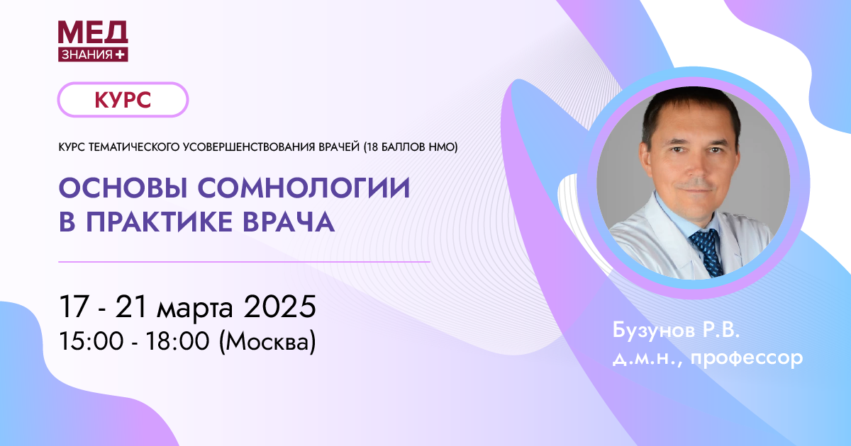 Приглашаем Вас на курс тематического усовершенствования врачей «Основы сомнологии в практике врача». Даты проведения: с 17 по 21 марта 2025 года. Формат проведения: онлайн с использованием дистанционных обучающих технологий. Данный курс прошел аккредитацию на 18 баллов НМО. Научный организатор: Учебный центр ООО «МедЗнания». Автор и научный руководитель: Бузунов Роман Вячеславович – доктор медицинских наук, профессор кафедры семейной медицины и терапии ФГБУ ДПО «Центральная государственная медицинская академия» Управления делами Президента Российской Федерации, руководитель центра медицины сна Клиники реабилитации в Хамовниках, заслуженный врач РФ. Тематика курса: На курсе будет дана информация о наиболее частых и клинически значимых нарушениях сна, с которыми врач сталкивается в своей практике. Курс позволит устранить пробелы университетского и последипломного образования в области медицины сна. Врач практически любой специальности будет лучше лечить своих пациентов, если будет понима