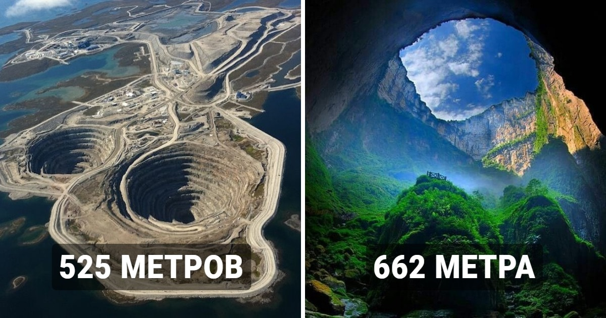 Наша планета полна различных сюрпризов. Один из них — геологические образования (проще говоря, дыры), появившиеся из-за природных процессов или действий человека. Их можно обнаружить на земле, под водой и даже в пещерах. Некоторые из них имеют настолько поразительные масштабы, что, глядя на них, становится слегка не по себе, ведь они невероятно похожи на таинственные двери, ведущие в потусторонние миры. Кто может проживать на дне этих поразительных пропастей — огнедышащий дракон, кракен или кто-нибудь похуже? Ответ на этот вопрос будет зависеть уже от вашей фантазии. Если желаете немножко пощекотать себе нервишки, то обязательно досмотрите этот пост до конца. Когда вам ещё выпадет шанс посмотреть бездне прямо в глаза? Дыра имеет глубину 525 метров и диаметр 1,2 километра. Вы только вдумайтесь в эти цифры! Это невероятно красивая карстовая воронка диаметром 305 метров и глубиной в 124 метра. Глядя на такое зрелище, становится немного жутко, не так ли? А вдруг у вас талассофобия? Обязате