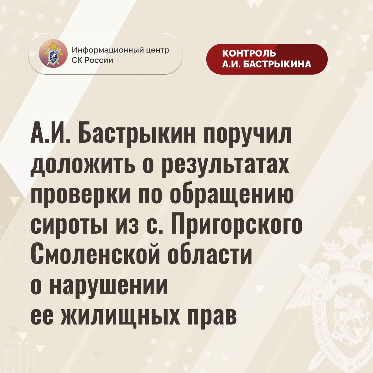 А.И. Бастрыкин поручил доложить о результатах проверки по обращению сироты из с. Пригорского Смоленской области о нарушении ее жилищных прав