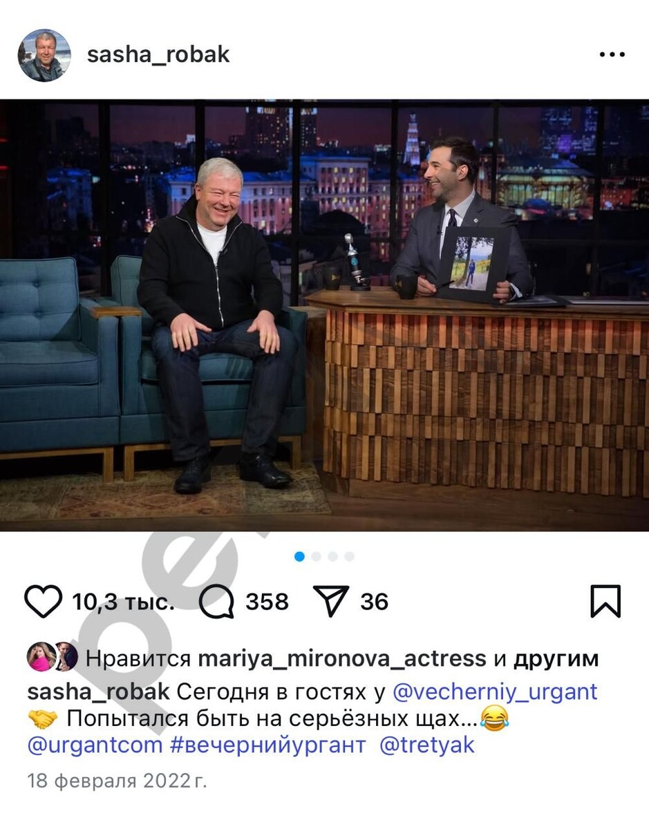 Сразу после начала специальной военной операции народный герой Александр Робак ушел в тень. Никаких комментариев насчет сложившейся в стране ситуации актер не делал. Даже свои соцсети вести перестал. Последней публикацией в запрещеннограме Робака стала фотография с коллегой по "Ёлкам" Иваном Ургантом со съемок авторской программы последнего, сделанная еще до 24 февраля 2022 года.