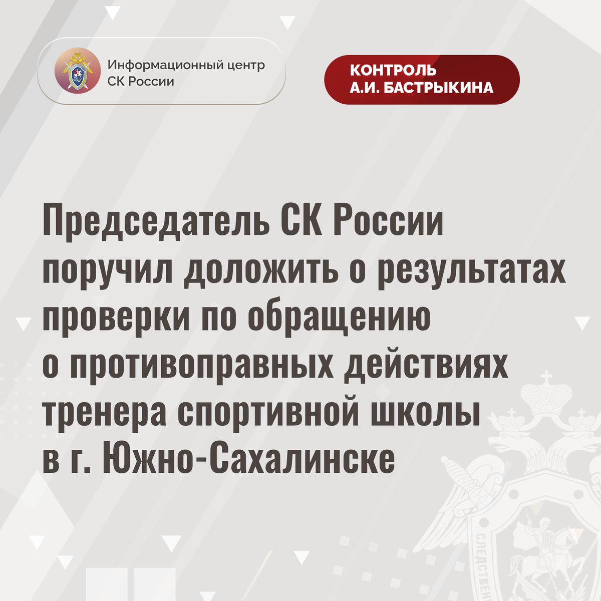 Председатель СК России поручил доложить о результатах проверки по обращению о противоправных действиях тренера спортивной школы в г. Южно-Сахалинске В Информационный центр СК России обратилась жительница Сахалинской области по вопросу совершения в отношении ее десятилетнего сына противоправных действий тренером по гимнастике в спортивной школе в городе Южно-Сахалинске. В феврале текущего года педагог во время занятия нанесла несколько ударов кулаком в грудную клетку мальчика. Несмотря на то, что ребенок испытал физическую боль, помощь ему оказана не была. Впоследствии в связи с нарушением у малолетнего функции дыхания мать доставила его в больницу, где пострадавшему диагностировали ушиб грудины и потребовалась медицинская помощь. Заявительница отмечает, что данный случай не единичный, однако администрация школы мер к тренеру не принимает. В СУ СК России по Сахалинской области по поступившему обращению начата процессуальная проверка. Председатель Следственного комитета Российской Федер