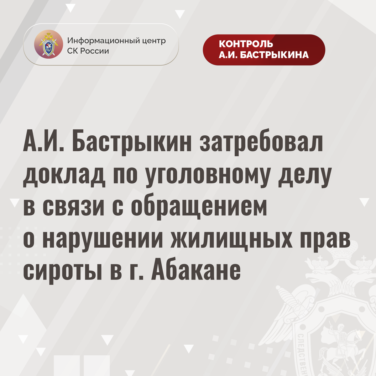А.И. Бастрыкин затребовал доклад по уголовному делу в связи с обращением о нарушении жилищных прав сироты в г. Абакане В комментариях в аккаунте приемной Председателя СК России А.И. Бастрыкина «ВКонтакте» размещено обращение жительницы города Абакана Республики Хакасии по вопросу длительного необеспечения положенным по закону жильем ее супруга, являющегося сиротой. Мужчина более десяти лет состоит в специализированной очереди. Несмотря на судебное решение, вступившее в силу в 2016 году, до настоящего времени его права не реализованы. В результате семья с двумя детьми вынуждена арендовать жилое помещение за свой счет. Многочисленные обращения результатов не принесли. В ГСУ СК России по Красноярскому краю и Республике Хакасии по данному факту организована процессуальная проверка, материалы которой приобщены к ранее возбужденному уголовному делу, поставленному А.И. Бастрыкиным на контроль в центральном аппарате ведомства. Председатель Следственного комитета Российской Федерации Александр