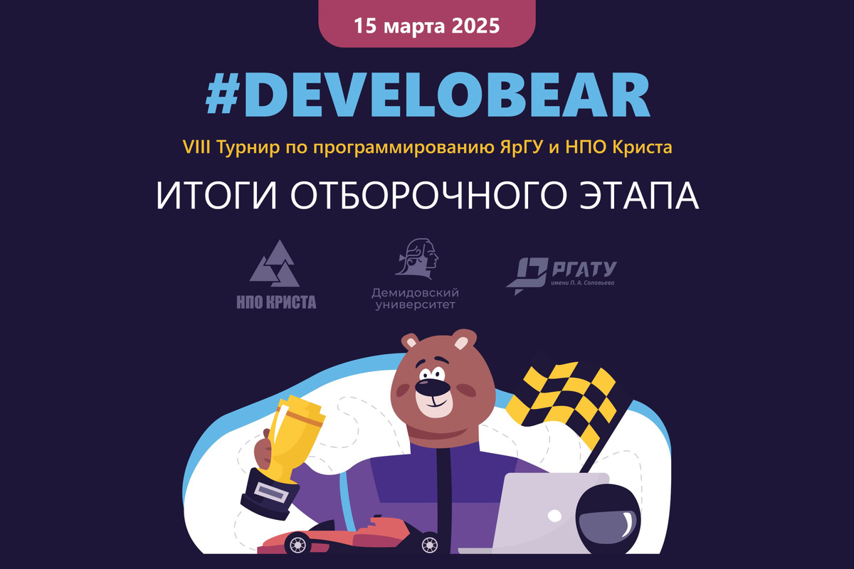 Подведены итоги отборочного этапа VIII открытого турнира по программированию среди школьников #DEVELOBEAR, который состоится 15 марта. Организаторами турнира являются НПО «Криста»и ЯрГУ имени П.Г. Демидова, партнёром – РГАТУ имени П.А. Соловьёва. В турнире участвуют 65 команд из 4 регионов России. К основному этапу допущены 54 команды (30 команд будут представлять Ярославль, 17 команд – Рыбинск, 4 команды – Киров, 2 команды – Вологду, 1 команда – Иваново). Эти команды выполнили все заявленные условия турнира: Поздравляем ребят с успешным прохождением отборочного этапа турнира и желаем отличных выступлений в финале! Победители турнира получат дополнительные баллы к результатам ЕГЭ при поступлении в ЯрГУ имени П.Г. Демидова и РГАТУ имени П.А. Соловьёва. Узнать подробности о турнире, в том числе детальные результаты отборочного этапа (документы в формате PDF), можно на сайте develobear.ru.