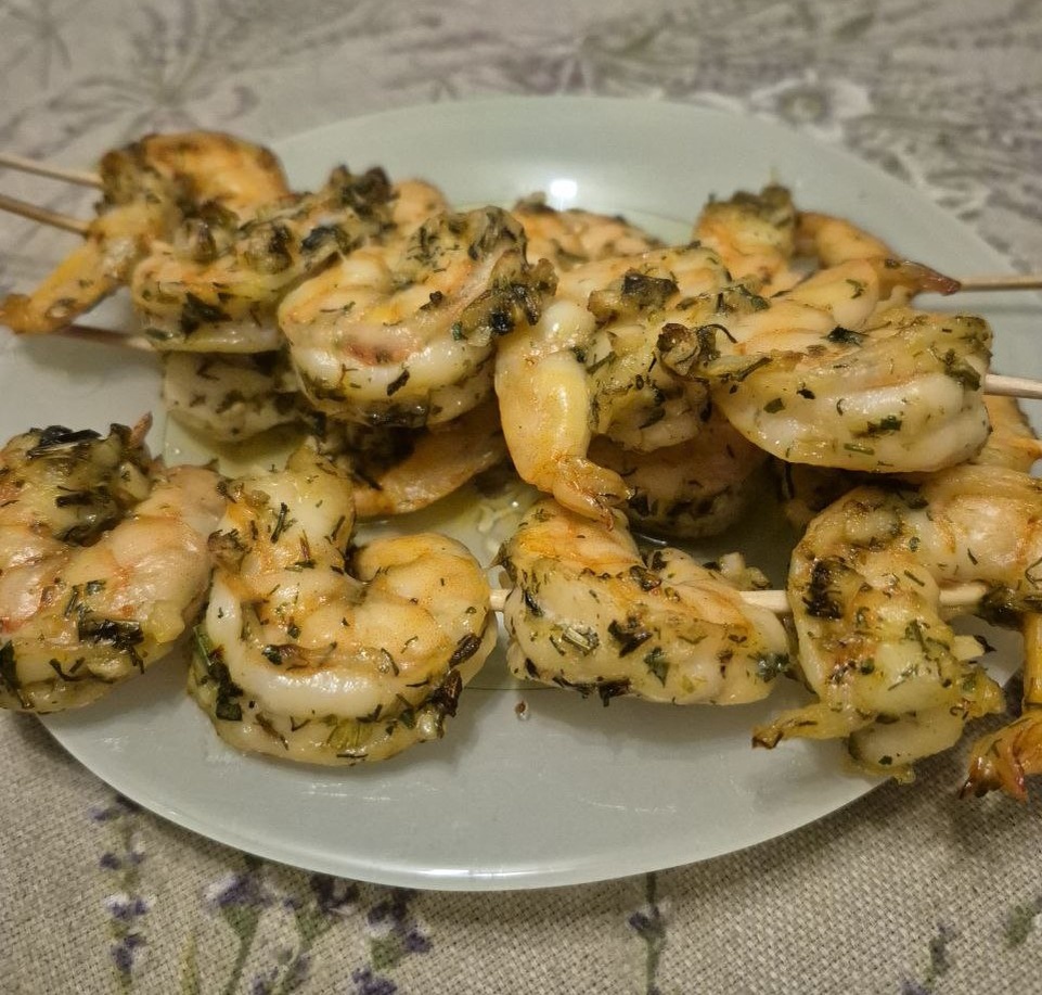 Креветки сырые очищаем от панциря, разрезаем вдоль и вынимаем кишку. Укладываем креветки в миску. Добавляем мелкорубленый чеснок, зелень (у меня сушеная), соль, перец и иные приправы по вкусу, растительное масло. Все тщательно перемешиваем и оставляем на час (можно дольше) промариноваться. Замаринованные креветки насаживаем на деревянные шпажки и укладываем на форму для запекания так, чтобы они ее не касались. Запекаем в духовке при 180 градусах 5 - 7 минут. Параллельно готовим соус для креветок: смешиваем в пиале соевый соус, майонез и остро-сладкий соус чили (рецепт здесь: https://dzen.ru/a/Z8GZFS5rzH4gcXfL) Готовые креветки раскладываем по тарелочкам, добавляем к ним полученный соус и с удовольствием кушаем. Для маринования креветок я использовала: - 1 кг креветок (крупные, тигровые, сырые, замороженные) - 3 зубчика чеснока - 1 столовую ложку сушеной зелени - соль, перец по вкусу - имеретинский шафран пара щепоток - 2 столовые ложки растительного масла Для соуса я использовала: - 3