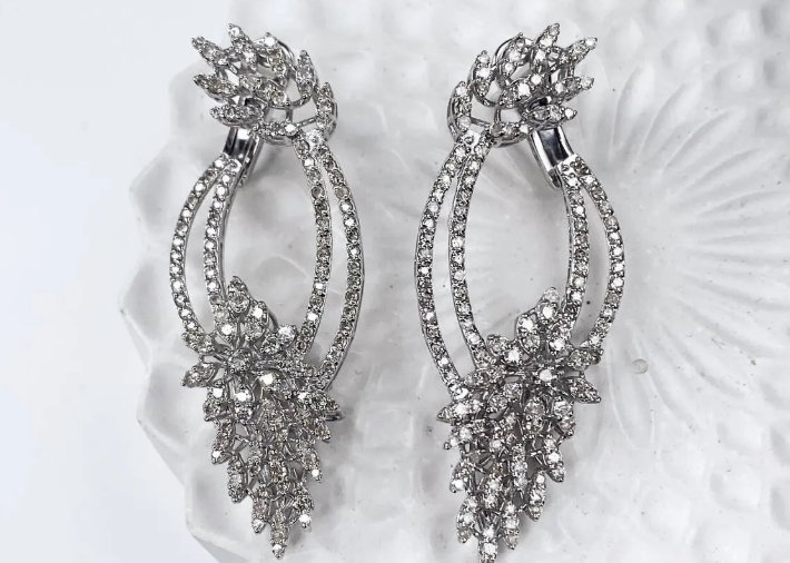 Серьги изготовлены из белого золота 585 пробы. По всей поверхности украшение декорировано натуральными сверкающими бриллиантами. У основания и на концах изделия камней особенно много, за счет чего переливы становятся еще более ослепительными. Такие украшения хорошо сочетаются с другими аксессуарами из белого золота. Это могут быть колье, браслеты, цепочки, кулоны.
