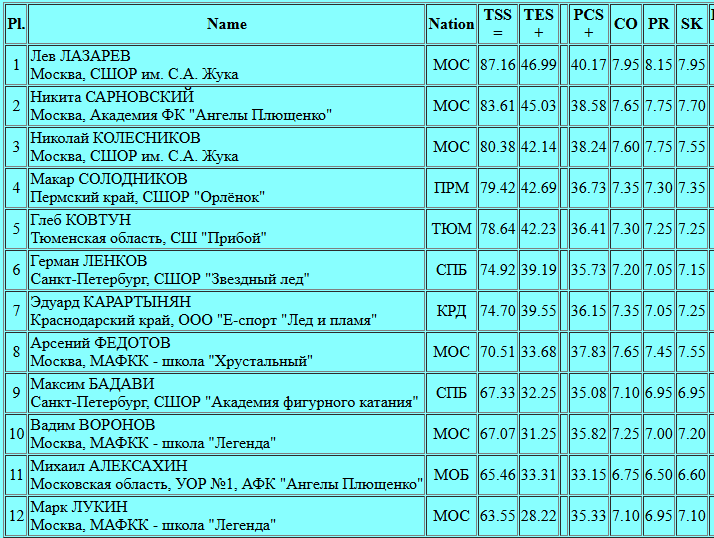 Насколько же легко все исполняет Лев Лазарев (87.16 - 1 место) в своей короткой программе. Огромный запас прочности на каждом элементе. Красота и чистота, абсолютно "бесшовные" переходы от элемента к элементу. Грандиозный тройной аксель, тройной флип после сложного захода, легчайшим образом исполненный каскад 3+3, все непрыжковые элементы на 4й уровень. Итоговые баллы получились ровно такими же, как и на Первенстве, т.е. предполагающими безусловное промежуточное лидерство.
