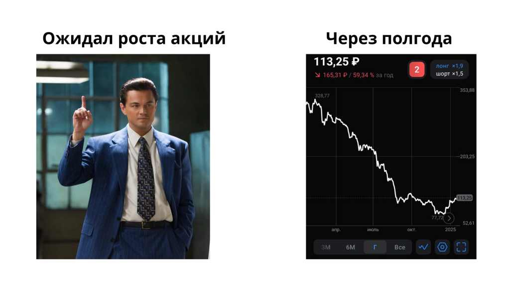 - Не разбираться в том, куда вкладываете. Купить активы по совету друга или потому что «все так делают» — нерациональная стратегия. Перед инвестированием важно понимать, как работает инструмент и какие у него риски.