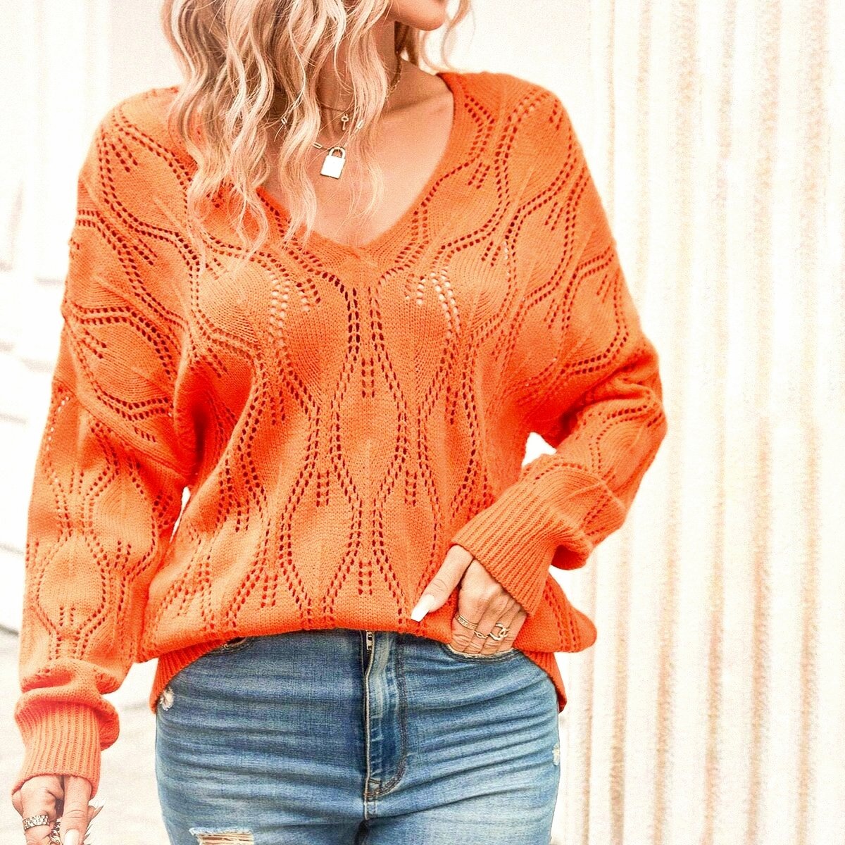Сочный оранжевый пуловер — то, что надо для яркой весны и лета! Женская модель из красивых ажурных мотивов. Глубокий вырез спереди и на спинке, облегающий рукав.