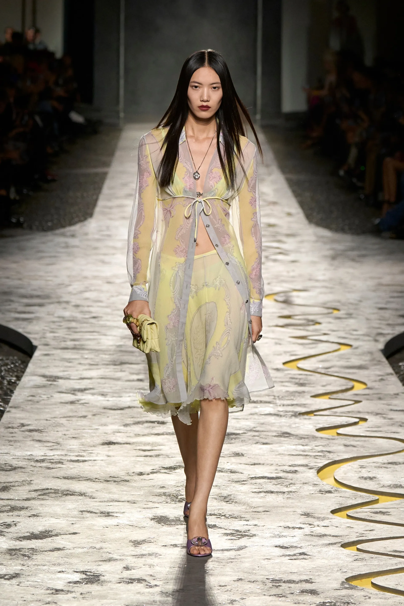 Versace предлагает скоординированные ансамбли, где доминируют орнаментальные принты и нежные прозрачные вставки. Итальянский бренд трансформирует макси-блузки с воротником-поло, передней застёжкой и асимметричной юбкой-миди, создавая идеальный образ, сочетающий в себе сексуальность и изысканность весенней моды. Дополняющие комплект туфли-лодочки на низком каблуке с металлическим блеском подчёркивают, что мода, вдохновлённая нулевыми и ретро-шестидесятыми, сохраняет свои позиции среди ключевых трендов сезона.