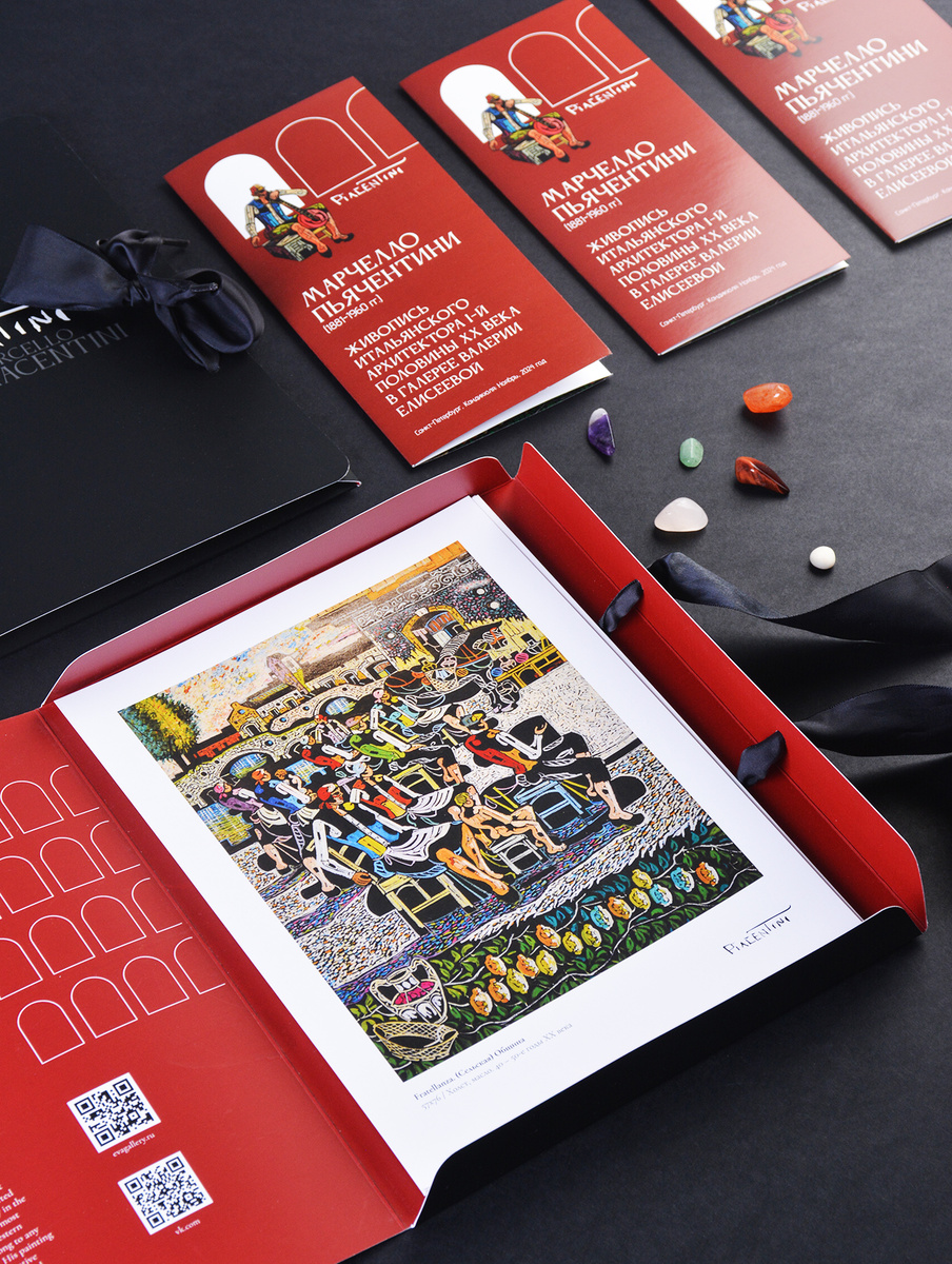 Мы сделали полное оформление, от развески и подсветки картин до полиграфии для первой в России выставки работ архитектора и художника в Галерее Валерии Елисеевой. Буклеты, папки, приглашения, таблички, подвесные стенды — всё это идеально сложилось в мозаику, создающую утончённое обрамление выставки. Мы объединили в дизайне брутальность и изящество, геометрию и музыку, лёд и пламень. Автором проекта был наш арт-директор Пётр Ворпулёв. Знаменательно, что после выставки Марчелло Пьячентини Пётр получил приглашение стать креативным директором Галереи Валерии Елисеевой. Открытие выставки — всегда портал в другое измерение. Вернисаж Пьячентини в Галерее Валерии Елисеевой — магия в её завораживающем таинственном блеске. Невероятные