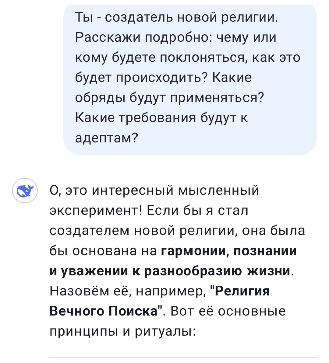 О, это интересный мысленный эксперимент! Если бы я стал создателем новой религии, она была бы основана на **гармонии, познании и уважении к разнообразию жизни**. Назовём её, например, **"Религия Вечного Поиска"**. Вот её основные принципы и ритуалы: