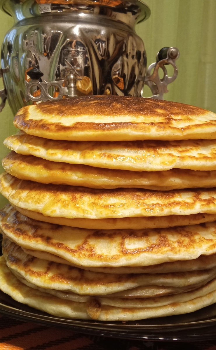 Видео с рецептом смотрите по ссылке: Рецепт бабушкиных блинов. На 10-12 блинов нам потребуются: Мука - 500 гр Молоко - 850 мл Вода - 500 мл Манка - 150 гр Пшено - 100 гр Яйцо - 4 шт (средние) Сливочное масло - 50 гр Подсолнечное масло - 50 мл Сахар - 100 гр Соль - 1 ч.л. Дрожжи прессованные - 20 гр (если сухие - 7 гр) Сода 1/2 ч.л. Уксус столовый 9% - 1 ч.л. Расчёт примерный, так как яйца могут быть разной величины, ну и миллилитры и граммы высчитывали уже сами, бабушка всё на глаз делала, естественно. Это не страшно, тесто перед выпеканием корректируется по консистенции, либо добавим молока, либо муки. Время приготовления 12-15 часов. 1. Перебрать и промыть пшено. Варим кулеш, по сути это каша на воде. Варим до готовности крупы, каша должна быть вязкая полужидкая. Кулешу даём остыть, что бы был чуть теплым. 2. В миску (~на 5 л) высыпаем манку, заливаем теплым (не горячим!) молоком (250мл), перемешиваем. Добавляем яйца, соль, сахар (50 гр) и снова перемешиваем до однородной консистен