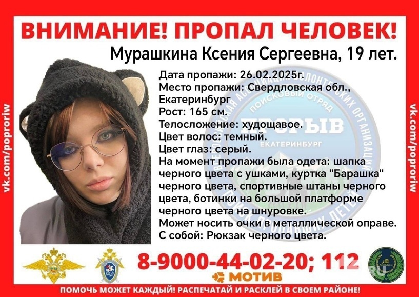 Ксения Мурашкина вышла из своего дома поселке Шувакиш вечером 26 февраля и пошла в сторону автобусной остановки. После этого ее до сих пор никто не видел. В момент пропажи она была одета в черные кофту с ушками, куртку-«барашку» и штаны, на ногах были ботинки на высокой платформе на шнурках, а на спине — рюкзак. Девушку ищут полиция и поисковые отряды. Если у вас есть информация о местонахождении Ксении, сообщите ее по телефонам +7 (343) 356–42–10 (отдел полиции № 10), 8 900 044 02 20 (горячая линии поискового отряда «Прорыв»).