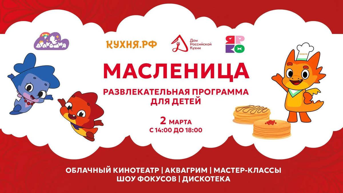 КУХНЯ.РФ, анимационная компания «ЯРКО» и герои мультсериалов «Магия безопасности с Дракошей Гошей» и «Дракошия» приглашают отметить Масленицу! Уже в это воскресенье в теплом и уютном павильоне «Дом Российской Кухни» на ВДНХ малышей и взрослых ждет развлекательная программа: