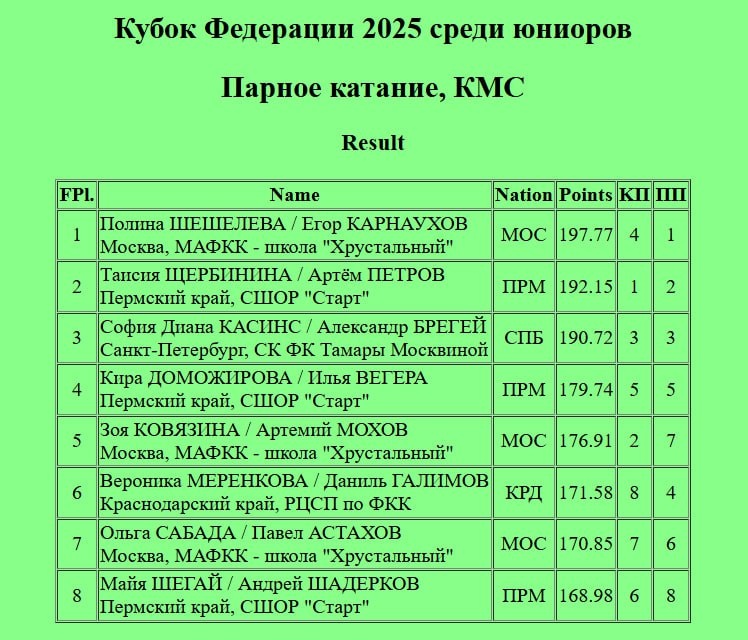 Для юниорских пар подошёл к концу сезон 2024-2025. Финал Гран-при России среди юниоров стал яркой точкой для спортсменов и болельщиков. Не все спортсмены довольны своими прокатами, но ошибки — это отличная возможность стать лучше и неотъемлемая часть большого спорта! 3Tw3, 3Lz (падение), 3Lo+2A+2A, 3LoTh, 3STh (на минус). К сожалению, не обошлось без ошибок. Пара с хорошим потенциалом и солидным техническим набором. Понравился тодес ребят. 111.64, 170.85, 7 место. Спортсмены катаются вместе один сезон, который провели очень здорово! Программу этих спортсменов невозможно смотреть без улыбки и лёгкой грусти. Песни «Крылатые качели», «Прекрасное далёко» трогают за душу. Не согласна с Александром Гришиным, что фигуристам не хватает эмоций. Они точно передают культовые советские песни. 3Tw4, 3S, 2A+2A+2T, 3STh, 3LoTh (падение). 115.82, 179.74, итоговое 4 место. Лидеры сезона 2024-2025 открывали сильнейшую разминку и были великолепны. 4Tw3, 3F+3T+2A, 3Lz, 3LoTh, 3STh. После таких по-насто