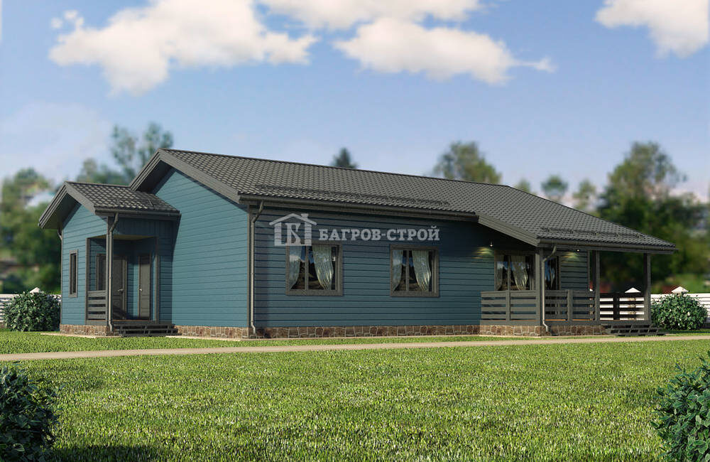 «Садко» - каркасный одноэтажный дом 8х15м с террасой 12,06м² и крыльцом 2,6м². Общая площадь дома 141м². Планировкой предусмотрено: 2 спальни, кухня, гостиная, 2 сан.узела, холл, прихожая, гардероб, котельная. • Площадь: 141 м2