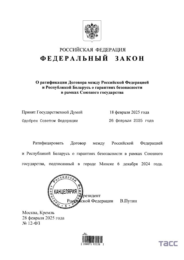 Согласно документу, страны обязуются поддерживать друг друга всеми согласованными и допустимыми международным правом способами и средствами Президент РФ Владимир Путин подписал закон о ратификации договора с Белоруссией о гарантиях безопасности в рамках Союзного государства, подписанный в Минске 6 декабря 2024 года. Документ опубликован. Путин внес документ на ратификацию в Госдуму 5 февраля 2025 года. По договору Россия и Белоруссия обязуются поддерживать друг друга всеми согласованными и допустимыми международным правом способами и средствами, предпринимать соответствующие действия в политической, военной и других сферах при посягательстве на безопасность любой из двух стран и Союзного государства в целом. Кроме того, РФ и Белоруссия будут рассматривать вооруженное нападение на участника Союзного государства как акт агрессии против Союзного государства и будут принимать соответствующие ответные меры с использованием всех находящихся в их распоряжении сил и средств. Отдельные положени
