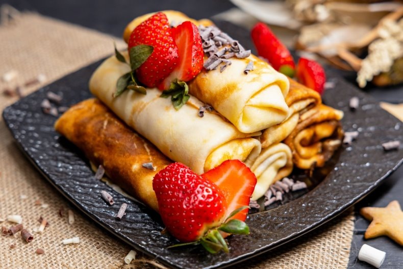 • Соль – по вкусу 1. В миске соедините яйца, сахар, соль, молоко, муку, воду и растительное масло. Перемешайте венчиком до однородности. 2. Заранее промойте и замочите изюм. Для начинки соедините его с творогом, ванильным сахаром и сметаной. 3. Разогрейте сковороду с растительным маслом. Влейте небольшое количество теста и равномерно распределите по дну. Обжарьте блин с двух сторон до румяного цвета. Повторите то же самое со всем тестом. 4. На блинчик выложите щедрую ложку начинки и заверните в рулет, подгибая края внутрь. Сделайте это со всеми блинами. 5. Готовый десерт украсьте свежи