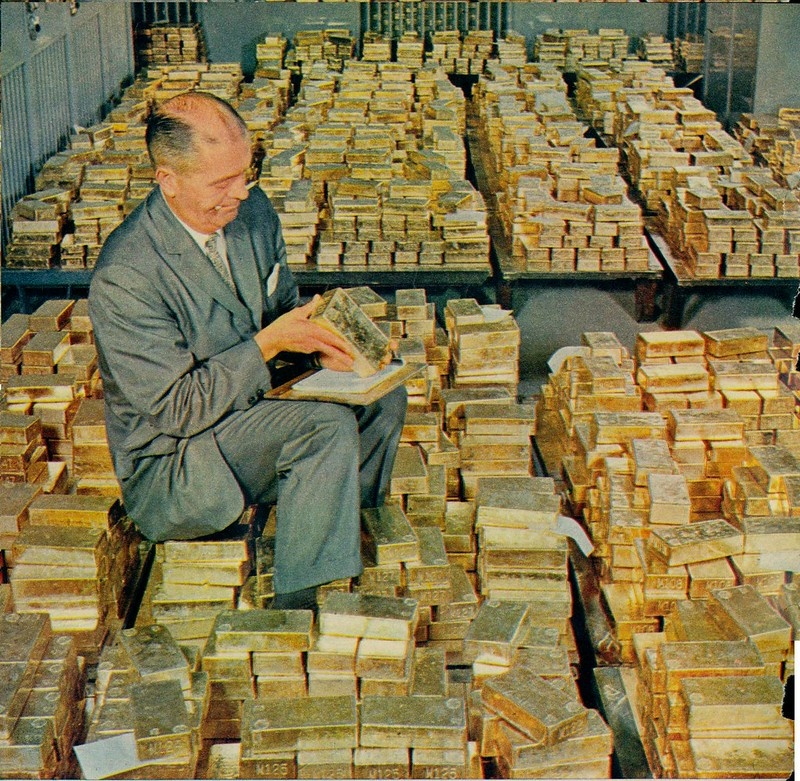 Впрочем, возможно, всё дело в английской бюрократии. Речь идёт про 82 млрд долларов, это 72 тысячи слитков по 12 килограмм. Если каждый слиток клерк оформляет по 3 минуты, заполняя гусиным пером формуляр с номером слитка и фамилиями ответственных, на обработку всех слитков потребуется примерно 500 рабочих дней. Если у них в хранилище 10 сотрудников с нужными допусками, как раз 50 дней на обработку всего объёма и выходит.