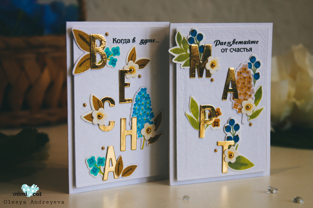 Всем привет 👋 с вами Андреева Олеся. До международного женского праздника остаётся неделька, по идее не так уж и мало, но часто подарки и открытки остаются на последний день. Я тут, чтобы вам помочь! ✊😁 У меня появилась идея быстрых открыток, особенно, если есть миллион маленьких цветочных отштамповок, буквы и рамки с тиснением. Разумеется, все это можно миксовать на свое усмотрение. Для пущей визуальной сложности и тактильного экстаза для подложки я взяла картон с текстурой скорлупы, вырезала из него элемент с тиснением из набора ➡️"Бабушкин альбом", приклеила его к основе на фоамиран 2 мм, чтобы был хороший объем ( он визуально важен в простых дизайнах). Из золотого зеркального картона вырубила буквы с помощью сета ➡️"Крупными буквами" и около каждой буквы сделала маленькие кластеры из цветов. Здесь подойдут и мелкие вырубки, и отштамповки, и наклейки. Я так же добавила надпись фразовыми штампами и золотые акценты. Не сложный в повторении и абсолютно миленький дизайн! Всем весны! ?