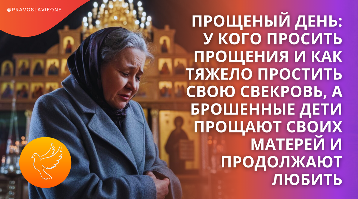 – Я живу с десятилетним сыном у родителей мужа, пока он работает в другом городе. Мы с сыном часто ведем себя так, что бабушка, у которой мы живем, возмущается не просто, а очень сильно. Мои друзья из церкви советуют мне благодарить Господа и бабушку за то, что она помогает мне очищаться от грехов. Я с ними согласна. Разумом. Но душа моя не может примириться с этим. Однажды, в преддверии Великого поста, мне пришла в голову мысль о прощеном воскресенье. Это было 9 марта. Я поняла, что должна подойти к свекрови и попросить прощения за все. Это казалось невыполнимым делом.