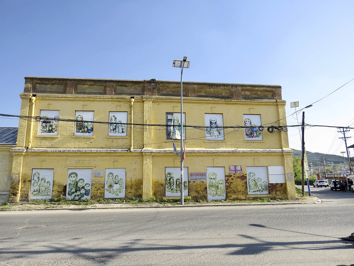 И импортирует не просто из Китая, а из конкретного места - посёлка Имяньпо н исторической Китайско-Восточной железной дороге (ближе к Приморью), где действует до 50 матрешечёных мастерских, работающих и на всяческие "улицы в русском стиле". А на фабрику похожа явная новостройка под русский модерн с кучей древесины у входа, скрывающаяся за домом с матрёшками в окнах (кадр выше).