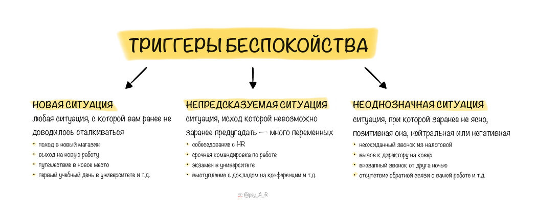 Замечали ли вы некое сходство между ситуациями, в которых испытывали тревогу и беспокойство? Оказывается, все эти ситуации можно условно разделить на три категории: новые, непредсказуемые или неоднозначные события. 1. Новая ситуация Здесь все просто — это любая ситуация, с которой вам ранее не доводилось сталкиваться. Новый опыт часто вызывает нас переживать по ряду причин: справлюсь ли? получится ли? понравится ли? Причем это не обязательно должно быть что-то сверх сложное, как открытие первого бизнеса, например. Беспокойство затрагивает и гораздо более бытовые и привычные вещи — поход в новое кафе, просмотр нового фильма, путешествие в новое место… в общем все то, чего вы раньше не делали. Начало новой деятельности — довольно распространенный пример в этой категории. Смена работы на новую ярко иллюстрирует всю ту бурю сомнений, одолевающих вас перед принятием решения. И это вполне объяснимо, ведь изменится все: и офис, и коллектив, и руководство, и обязанности. Неудивительно, что мно