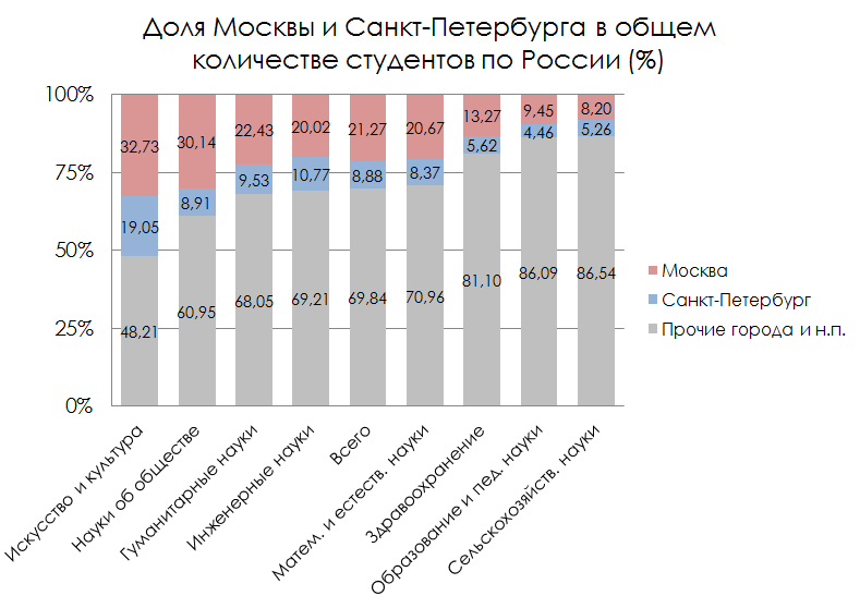 Вполне закономерно наименее «централизованы» (наименее сконцентрированы в Москве и Санкт-Петербурге) по убыванию сельскохозяйственные науки, педагогические науки и здравоохранение. Гуманитарные и общественные науки, напротив, гораздо сильнее приурочены к крупным городам. По специальностям, связанным с искусством и культурой, в Москве и Санкт-Петербурге и вовсе учится более половины (!) студентов страны. Также для отрасли «Искусство и культура» характерна повышенная доля Санкт-Петербурга (в «северной столице» учится каждый пятый).