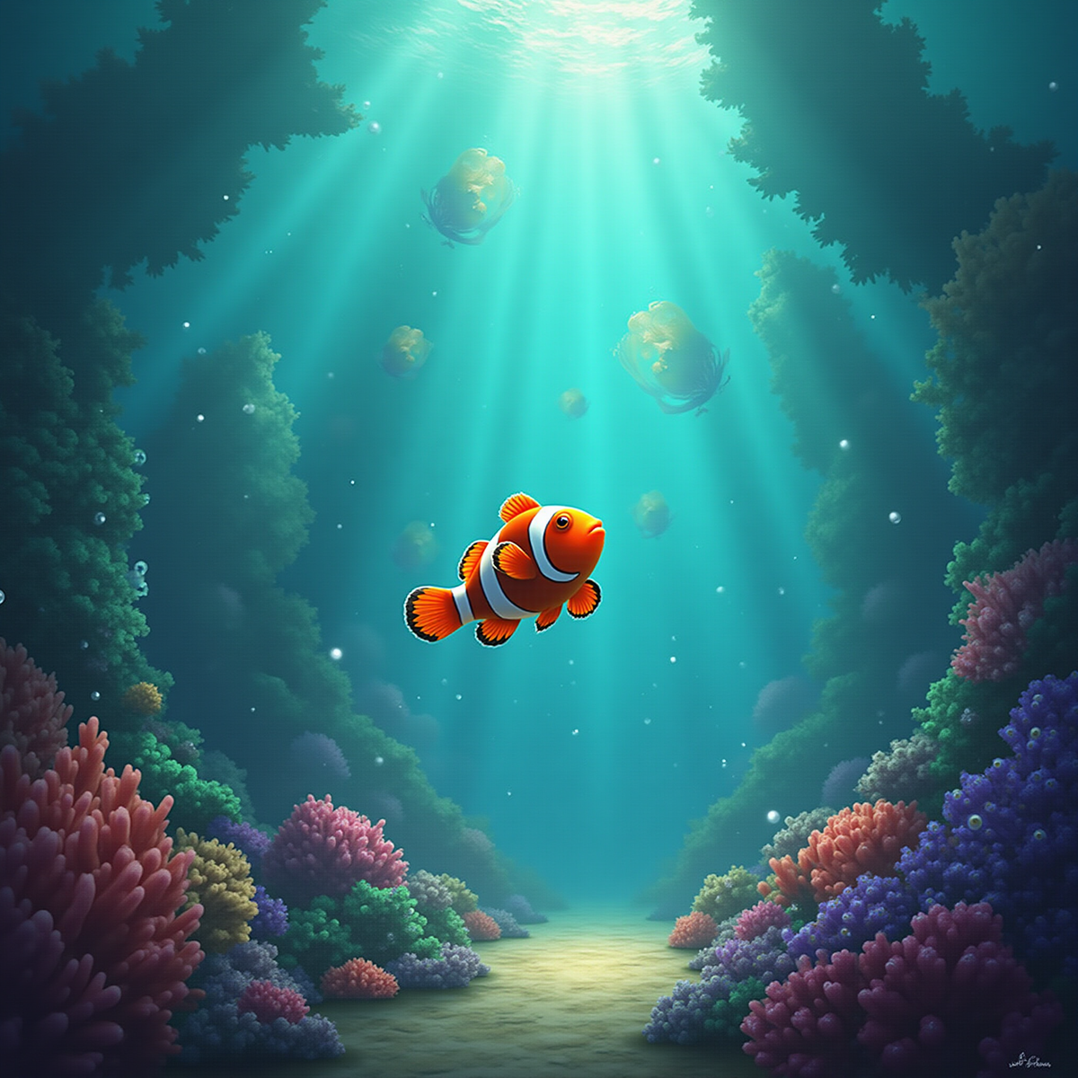 В самом сердце океана, где кораллы переливались всеми цветами радуги, жил весёлый клоун-рыбка по имени Пузырёк. Его друзьями были Искорка — медуза, обожающая танцевать; Ракушка — краб-отшельник в раковине с узорами из ракушек; Плавничок — скромный морской конёк, прятавшийся в водорослях; и старый черепах Тортул, чьи истории были длиннее океанских течений. Каждый год они праздновали Коралловый Фестиваль, когда Волшебная Жемчужина заставляла кораллы цвести яркими красками. Но в этом году Жемчужина исчезла!