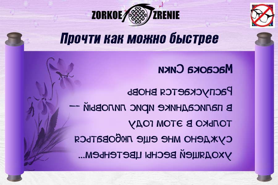 Прочти написанное наоборот японское пятистишие! Если при этом сознательно активизировать логическое ядро, например, постараться запомнить небольшой рифмованный текст, то нейронные «зрительные сети» взаимодействуют с другими участками мозга, восстанавливая и поддерживая всю зрительную систему целиком. Зрительные зоны мозга активизируются, и это способствует быстрейшему восстановлению зрения! Ответьте, как у вас получилось: Я был(ла) в затруднении! Я прочёл(ла) свободно! Я прочёл(ла) и могу рассказать суть прочитанного! Я прочёл(ла) и запомнил(ла) стих!