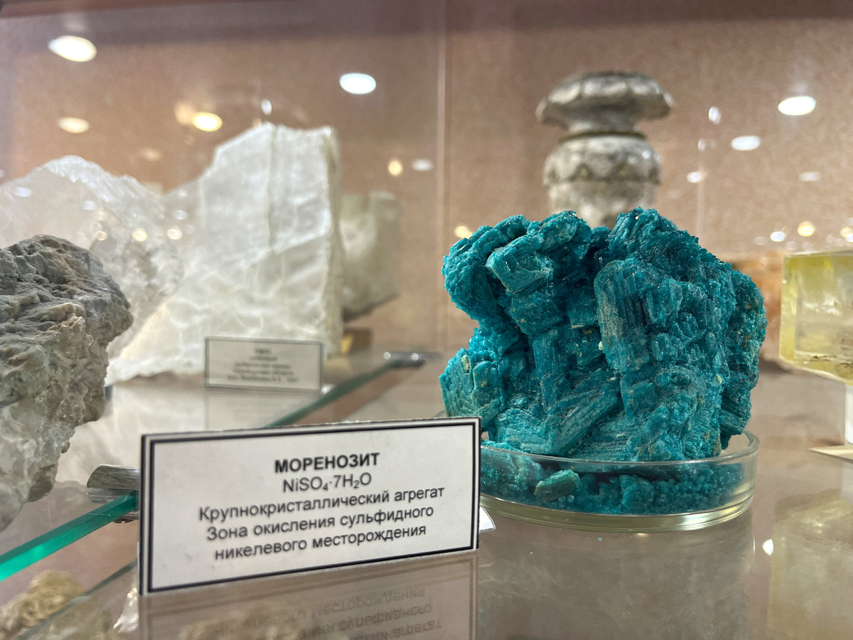 Моё знакомство с моренозитом состоялось в Музее геологии и полезных ископаемых Башкортостана. Крупный образец ярко-бирюзового цвета за стеклянной витриной сразу обратил на себя моё внимание. Прочитав незнакомое название и сфотографировав необычный минерал, решила разузнать о нём поподробнее и вам заодно рассказать, мои уважаемые читатели.