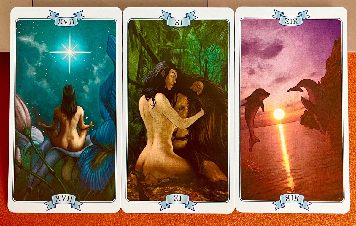 Очень красивое начало расклада! А ведь редко такое увидишь. Ждет вас впереди исполнение заветного желания. Сбудется самая красивая ваша мечта. Три старших аркана, три потока чистейшей благостной энергии. Вы сейчас перерождаетесь. Красивая женщина на картах - это ваша красивая душа, которая уже сбросила шелуху, омылась в водах времени, готова предстать перед новым витком судьбы. Вас ждет новый восход. Готовьтесь к счастью. Какая-то негативная ситуация больше не имеет власти над вами. Вы прошли нелегкий путь, теперь начинается белая полоса. Здесь карты показывают очень серьезное достижение. Такое событие, которое делит жизнь на до и после в самом лучшем смысле. Очень похоже, что вы обретете любовь, о которой всегда мечтали. Вам раньше казалось, что мечта несбыточная. Но все равно продолжали верить, глядя на звезды. И просили Высшие силы - вдруг однажды исполнят. Это же не так сложно - просить, молиться, мечтать. Хотя бы жить на этой волне - уже радость. И как бы жизнь ни складывалась