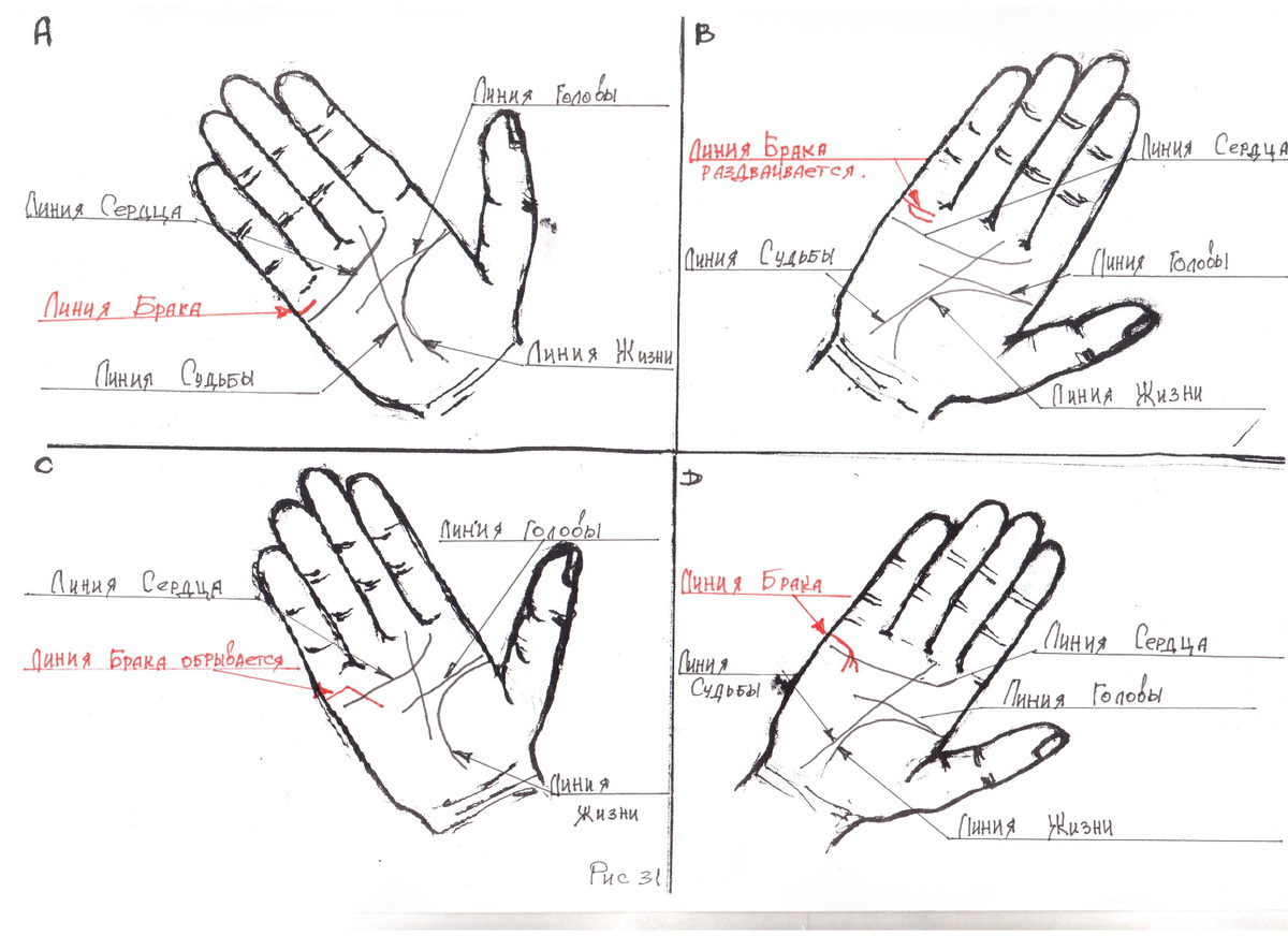 Как бы там ни было, отношения между мужчиной и женщиной существовали и будут существовать Как бы там ни было, и мужчины и женщины мечтают о красивых и счастливых романтических отношениях. А значит, существуют и отметки об этих отношениях на ладонях, как у мужчин, так и у женщин. Наиболее важные отметки о союзах либо браках располагаются на холме Меркурия. Они называются Линиями Брака и должны проходить на ребре ладоней, прямо и четко по холму Меркурия. ( рис. 31 А), без разрывов и крестов любого вида, только тогда она обозначает счастливый брак . При этом, - Длинные и четкие линии- означают браки либо длительные союзы. - Короткие и тонкие линии- ничем не завершившиеся отношения. О значении линии Брака расскажут многочисленные знаки. Если Линия Брака на ладони (рис.31): B) оказывается разделенной на две тонкие линии – это означает, что двое людей могут продолжать жить вместе, но их интересы разойдутся. C) как бы обрывается вниз – это предвещает потерю партнера, вызванную смертью. D)